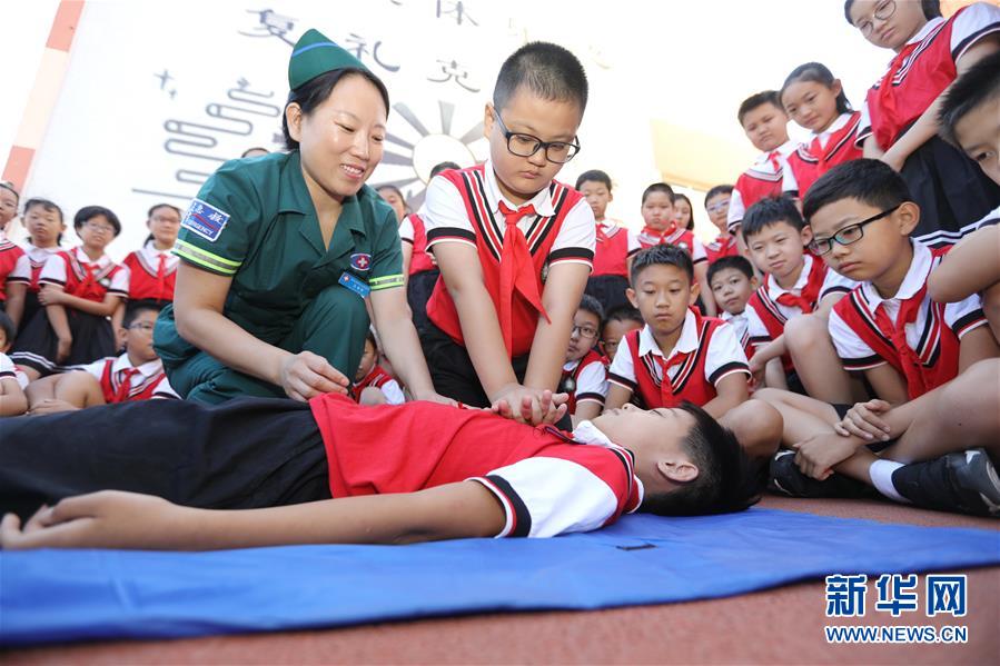 9月7日,衡水市康复街小学学生在医护人员指导下进行心肺复苏急救技能练习。 当日,河北省衡水市康复街小学联合衡水市第五人民医院开展“急救知识进校园”主题活动。医护人员现场向学生传授心肺复苏、包扎等急救技能,提升孩子们的应急救护意识和能力,迎接“世界急救日”的到来。 新华社记者 朱旭东 摄