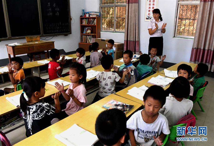 9月7日,河南省嵩县饭坡镇青山村小学老师白会娟带着一年级学生们做课堂游戏。 饭坡镇青山村小学位于河南省嵩县的偏远山区,学校现有110名学生,6名在编教师,其中4名教师都出自一家。今年35岁的杜明伟曾是一名镇中学的教师,2009年,杜明伟在青山村小学任教了29年的父亲杜同升因病不能继续教学,眼看着村小学面临停课,杜明伟毅然说服了妻子白会娟,双双回到青山村小学接过父亲手中的教鞭,一干就是近10年。 青山村小学远离镇区,交通不便,近10年间,杜明伟夫妇眼看着年轻教师来了又走。为了补充师资力量,杜明伟在镇上小学任教的叔叔杜同新申请调到青山村小学教学,白会娟也说服了全县招教考试总分第一名的弟弟白海伟来到青山村小学任教,一家两代五人,传承坚守在青山村小学,守护着山村孩子的求学梦想。 近几年,通过社会各界的帮助,学校的硬件条件得到了明显提升,还新建了书屋,白会娟成为图书管理员。老师们坚持带着学生阅读,教学生写读书日记,让学生养成了良好的阅读习惯。 如今村子里考上大学的学生数量增多,杜明伟心里有说不出的高兴:“小学是人生的奠基阶段,要让孩子们把基础知识学扎实,培养他们良好的阅读习惯,树立正确的价值观,只要还有学生,我们就要一直坚持下去。” 新华社记者李安摄