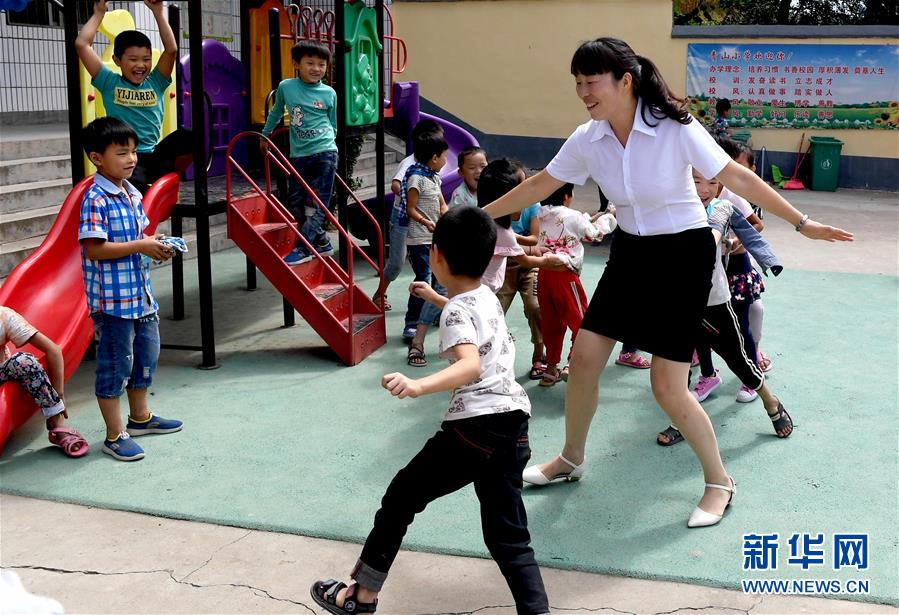 9月7日,河南省嵩县饭坡镇青山村小学老师白会娟在课间带着学生做游戏。 饭坡镇青山村小学位于河南省嵩县的偏远山区,学校现有110名学生,6名在编教师,其中4名教师都出自一家。今年35岁的杜明伟曾是一名镇中学的教师,2009年,杜明伟在青山村小学任教了29年的父亲杜同升因病不能继续教学,眼看着村小学面临停课,杜明伟毅然说服了妻子白会娟,双双回到青山村小学接过父亲手中的教鞭,一干就是近10年。 青山村小学远离镇区,交通不便,近10年间,杜明伟夫妇眼看着年轻教师来了又走。为了补充师资力量,杜明伟在镇上小学任教的叔叔杜同新申请调到青山村小学教学,白会娟也说服了全县招教考试总分第一名的弟弟白海伟来到青山村小学任教,一家两代五人,传承坚守在青山村小学,守护着山村孩子的求学梦想。 近几年,通过社会各界的帮助,学校的硬件条件得到了明显提升,还新建了书屋,白会娟成为图书管理员。老师们坚持带着学生阅读,教学生写读书日记,让学生养成了良好的阅读习惯。 如今村子里考上大学的学生数量增多,杜明伟心里有说不出的高兴:“小学是人生的奠基阶段,要让孩子们把基础知识学扎实,培养他们良好的阅读习惯,树立正确的价值观,只要还有学生,我们就要一直坚持下去。” 新华社记者李安摄