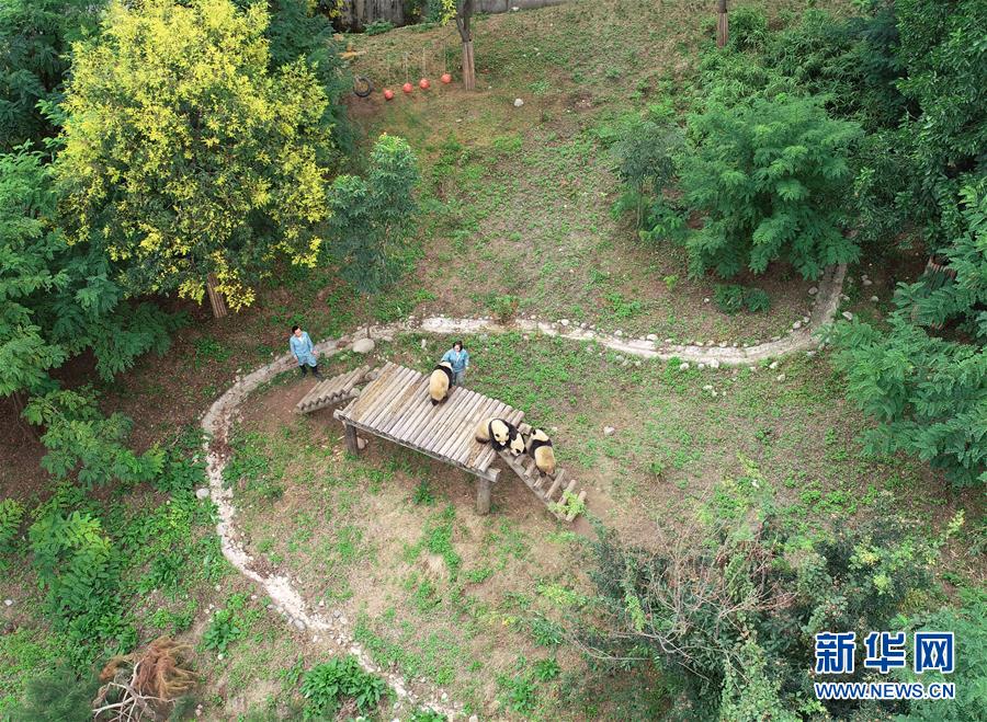 9月7日,在陕西省珍稀野生动物抢救饲养研究中心,工作人员与大熊猫互动(无人机拍摄)。