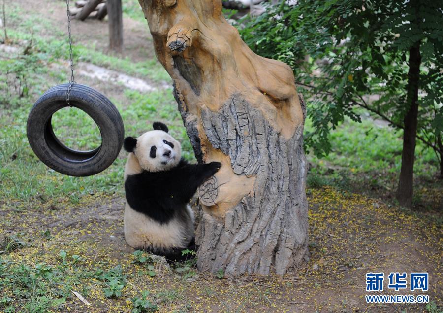 9月7日,在陕西省珍稀野生动物抢救饲养研究中心,大熊猫“善仔”在树下休息。
