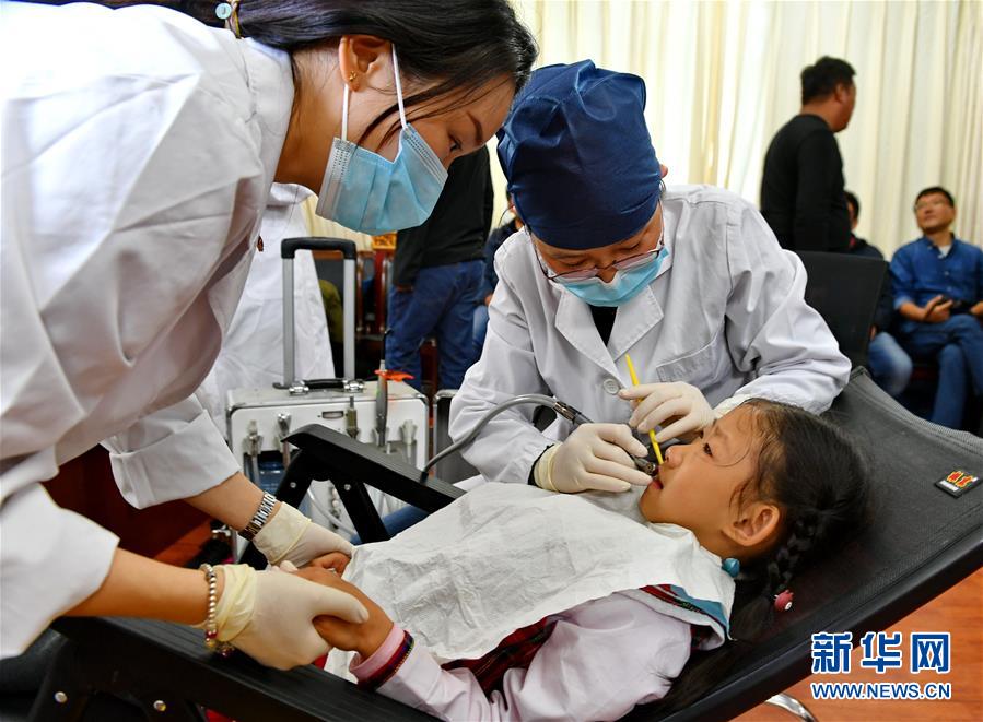 9月7日,上海市徐汇区牙病防治所医生苏红如(前右)在拉萨为一名小学生做口腔诊疗。
