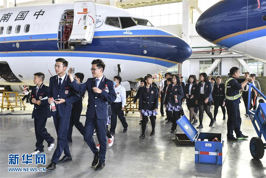 9月7日,新疆众志国际学校“飞友俱乐部”的学生在南航新疆分公司飞机维修基地101机库参观。