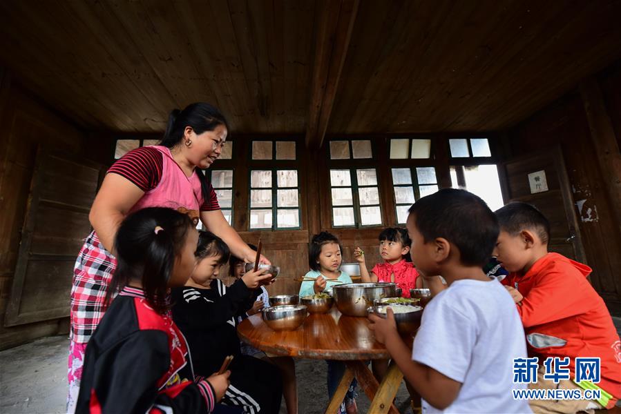 9月7日,在贵州省丹寨县排调镇党干村教学点,杨昌军的妻子李丽在照顾孩子们吃营养午餐。