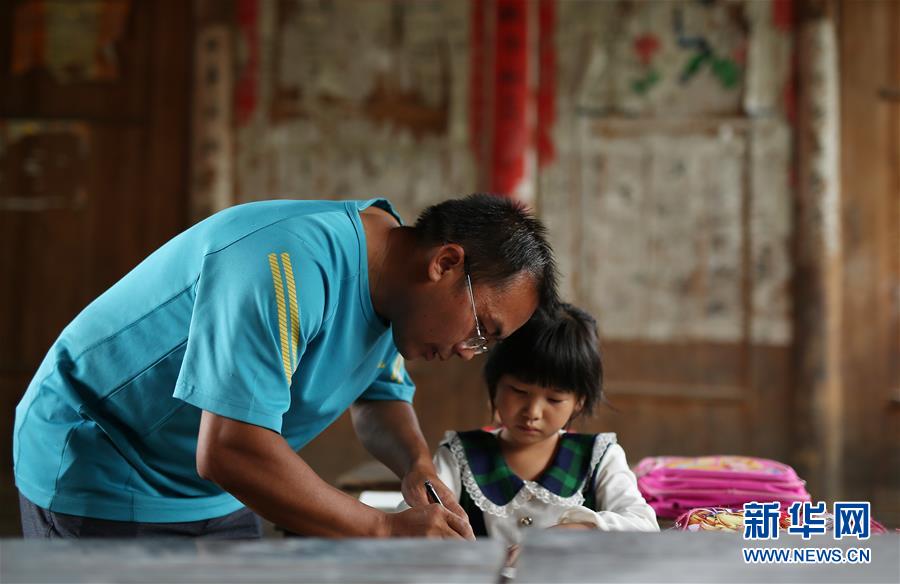 9月7日,在贵州省丹寨县排调镇党干村教学点,杨昌军在辅导一年级学生王芳英做作业。