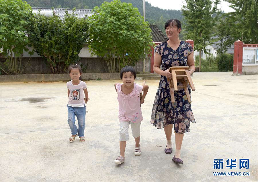 9月7日,在茶儿垅村教学点内,蒋秀兰老师(右)准备带领孩子们做游戏。
