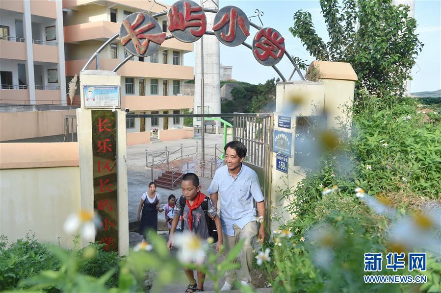 9月3日,在长乐区长屿小学,王开佺、林珠金在放学后护送学生走出校门。 新华社记者 宋为伟摄