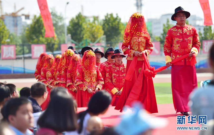 9月9月,在石家庄石门实验学校的校园集体婚礼上,新郎用红绸牵着新娘。 新华社发(章朔 摄)