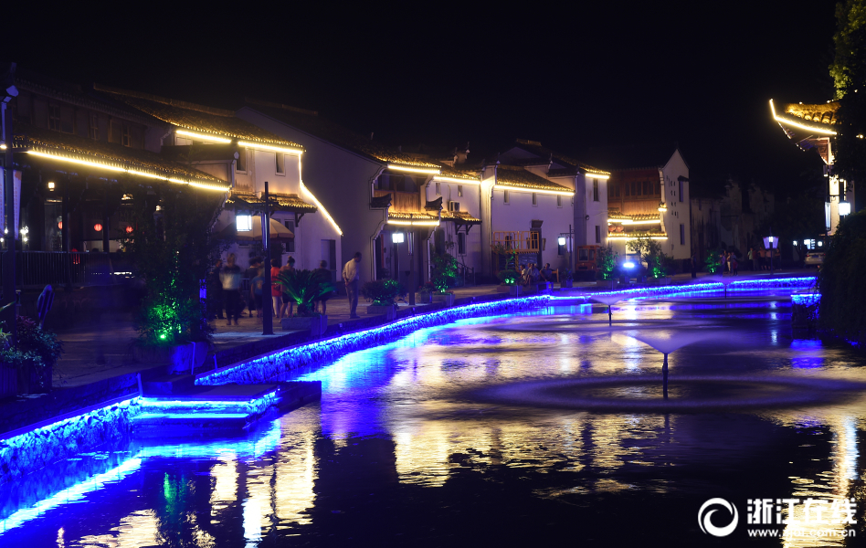 9月10日傍晚,杭州富阳东梓关村亮灯工程开启,村里的屋檐走廊被霓虹灯照亮,古村就像一颗夜明珠,璀璨夺目。昔日传统村落华丽转身,正吸引越来越多的游客前来游玩。(浙江在线记者 吴元峰 摄)