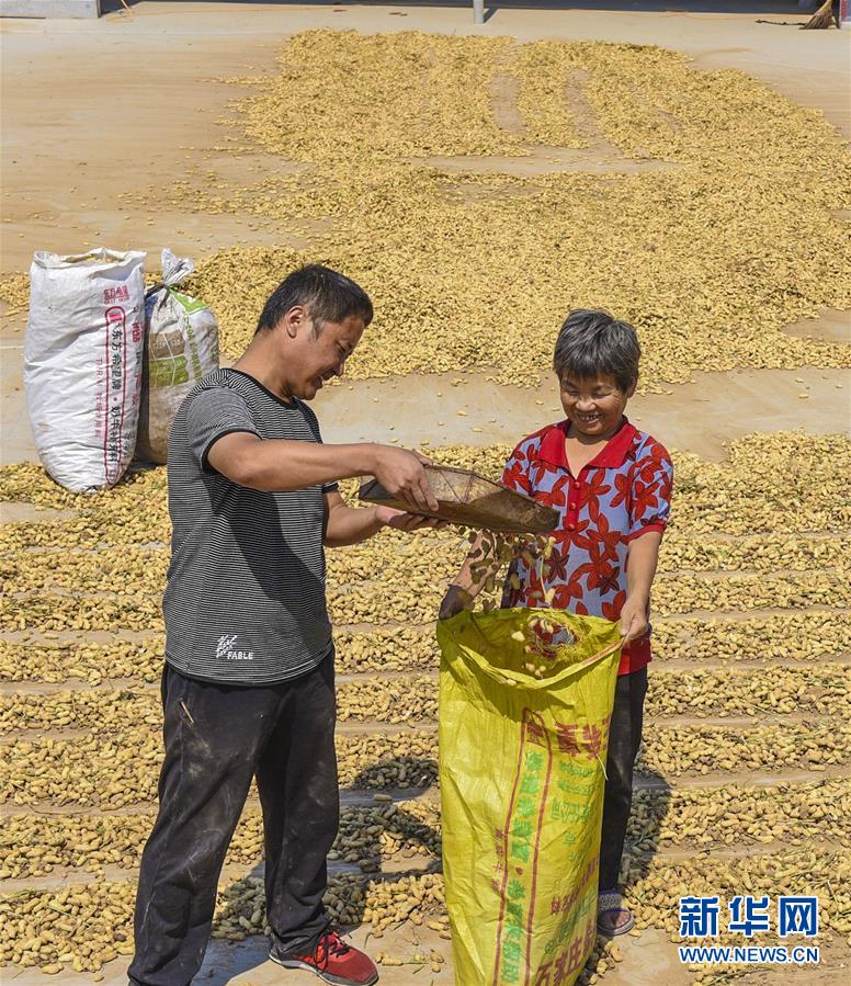 9月11日,河北省深州市乔屯乡林家铺村农民将花生装袋。 新华社记者 李晓果 摄