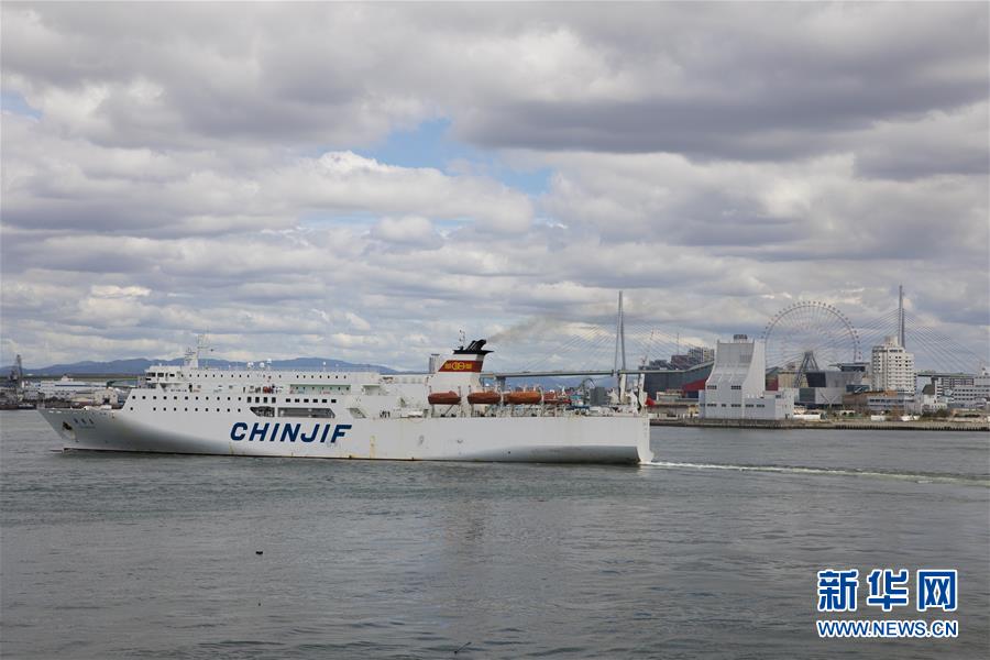9月11日,在日本大阪,“新鉴真”号渡轮驶离港口。 11日中午,“新鉴真”号渡轮搭乘287名乘客从大阪港国际轮渡中心起航,其中包括经中国驻大阪总领馆协调登船的181名因台风滞留大阪的中国旅客。 新华社记者杜潇逸摄