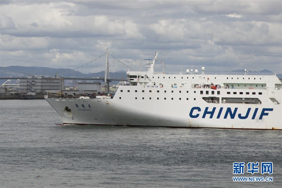 9月11日,在日本大阪,“新鉴真”号渡轮驶离港口。 11日中午,“新鉴真”号渡轮搭乘287名乘客从大阪港国际轮渡中心起航,其中包括经中国驻大阪总领馆协调登船的181名因台风滞留大阪的中国旅客。 新华社记者杜潇逸摄