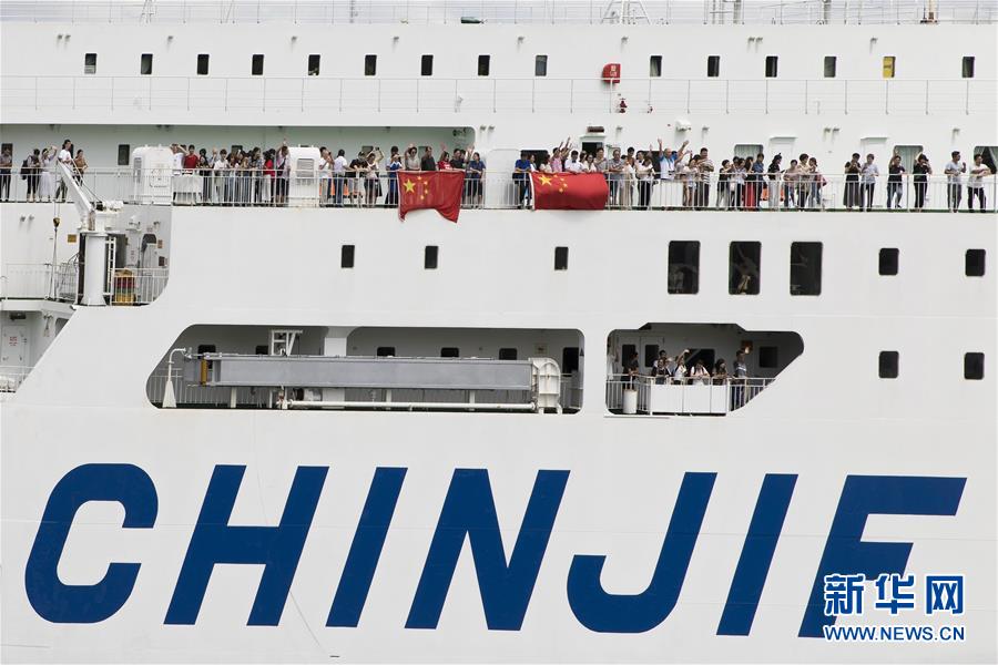 9月11日,在日本大阪“新鉴真”号渡轮上,中国旅客聚集在船舷边,与岸边送别的总领馆工作人员挥手告别。 11日中午,“新鉴真”号渡轮搭乘287名乘客从大阪港国际轮渡中心起航,其中包括经中国驻大阪总领馆协调登船的181名因台风滞留大阪的中国旅客。 新华社记者杜潇逸摄