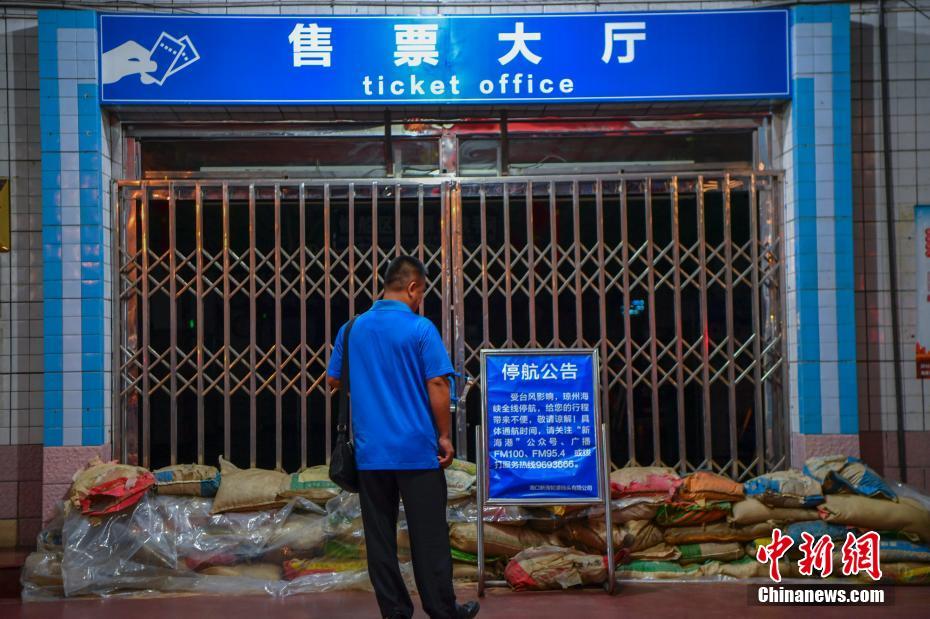 海口港客运站售票大厅已经关闭,并用沙袋垒砌防水墙。 骆云飞 摄