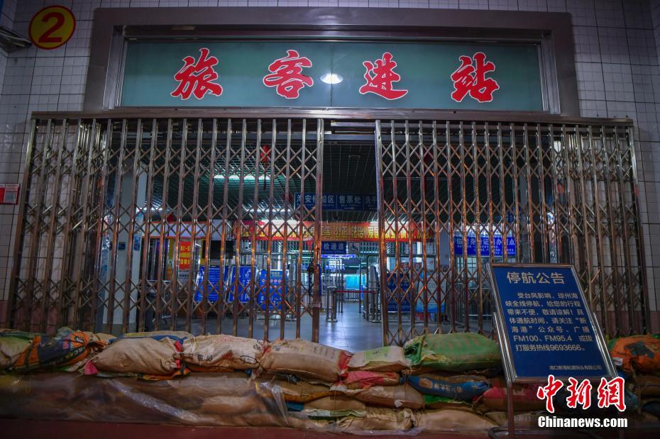 海口港客运站码头的各进出口已用沙袋垒砌防水墙,用于抵御即将到来的台风。 骆云飞 摄