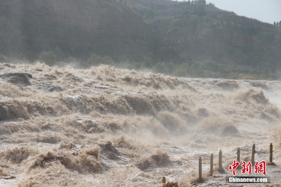 近日,黄河壶口瀑布水量大增,湍急的水流携带大量的泥沙奔涌而下,主瀑布几乎没有落差,出现“水岸齐平”的景象。 阿琳娜 摄