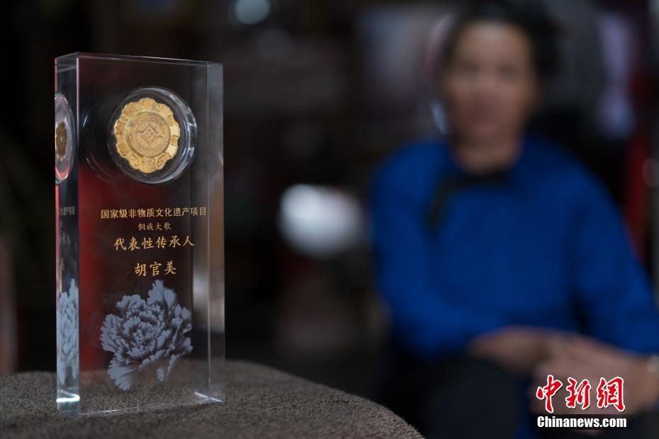9月13日,贵州宰荡侗寨,胡官美看着颁发给她的国家级非物质文化遗产项目侗族大歌代表性传承人奖杯。 中新社记者 贺俊怡 摄