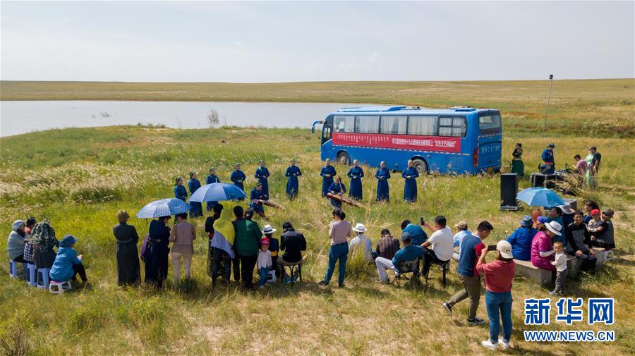 在内蒙古自治区锡林郭勒盟镶黄旗宝格达音高勒苏木浩尼钦哈夏图嘎查的一处草场,镶黄旗乌兰牧骑的队员在为牧民表演文艺节目(9月13日,无人机航拍)。 新华社记者 彭源 摄