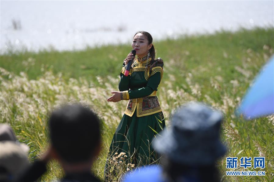9月13日,在内蒙古自治区锡林郭勒盟镶黄旗宝格达音高勒苏木浩尼钦哈夏图嘎查的一处草场,镶黄旗乌兰牧骑的队员在为牧民表演文艺节目。 新华社记者 彭源 摄
