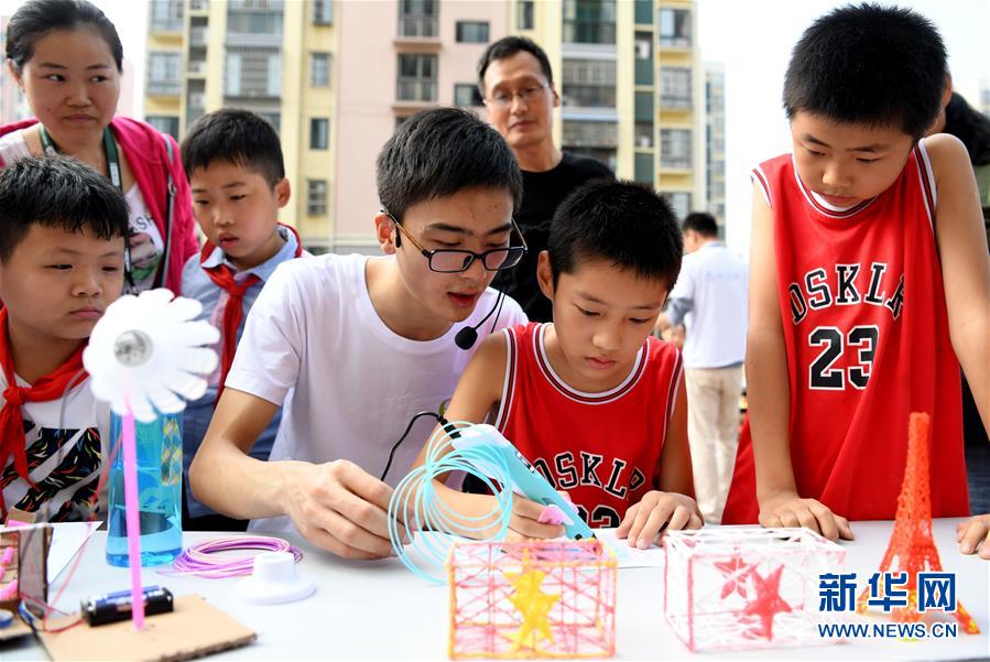 9月15日,在安徽省合肥市常青街道淝南社区举行的科普体验活动上,志愿者与孩子一起制作科普模型。