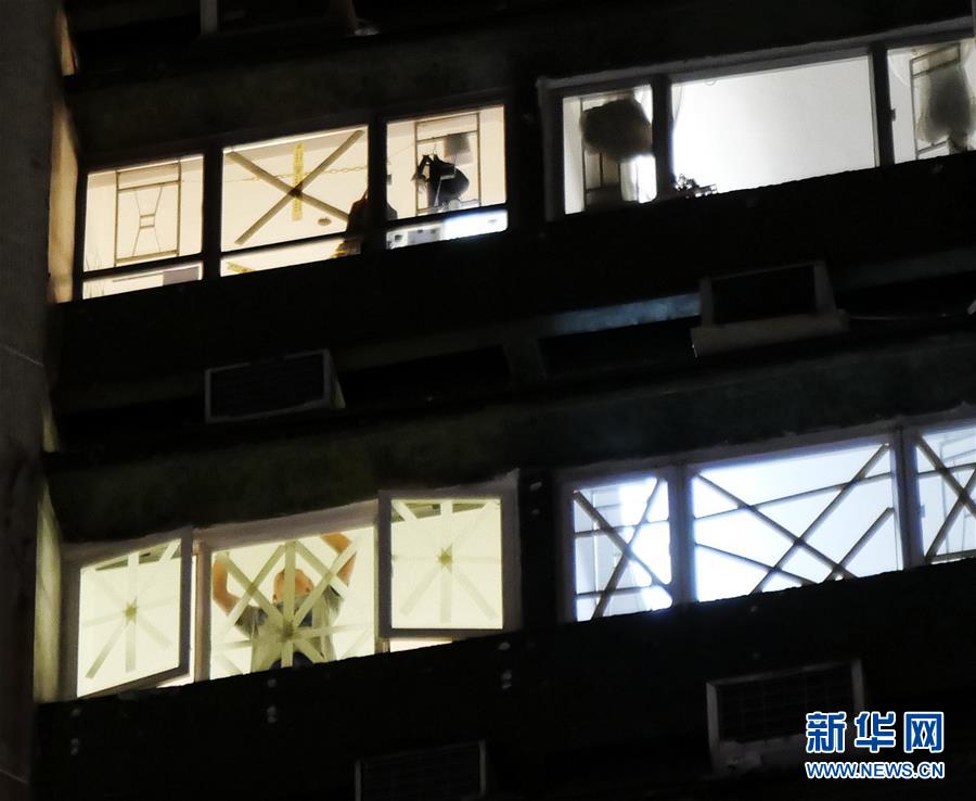 9月15日,在位于香港红磡的一座住宅楼,市民在窗户上贴胶纸,以防台风破坏。 香港天文台预计,超强台风“山竹”将于本周日最接近香港。香港市民已做好全面防御台风的准备。 新华社发(王申 摄)