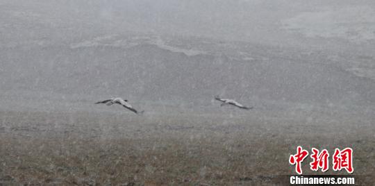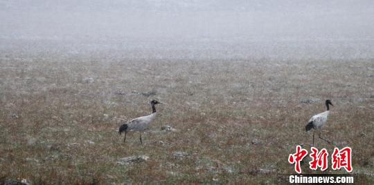 连日来,受冷空气影响,甘肃张掖肃南裕固族自治县皇城草原银装素裹,两只雪域“精灵”黑颈鹤在皑皑白雪中“与雪共舞”。黑颈鹤生长、繁殖在海拔2500-5000米的高原的沼泽地、湖泊及河滩地带。近年来,随着祁连山生态环境日益好转,祁连山生态保护区(肃南段)相继发现雪豹、黑颈鹤、白唇鹿等各种候鸟及野生动物,此次黑颈鹤现身肃南草原尚属首次。