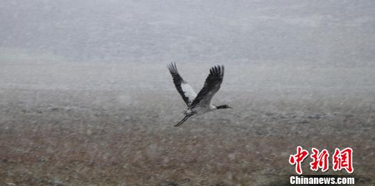 甘肃肃南:高原“精灵”黑颈鹤雪中嬉戏