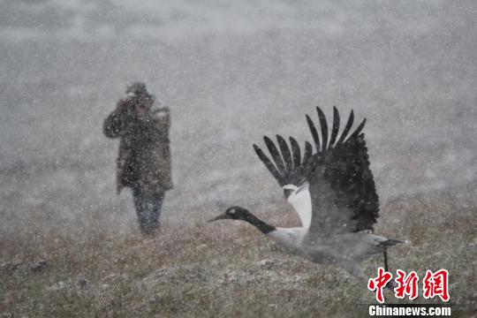 图为摄影爱好者雪地里拍摄黑颈鹤。 武雪峰 摄