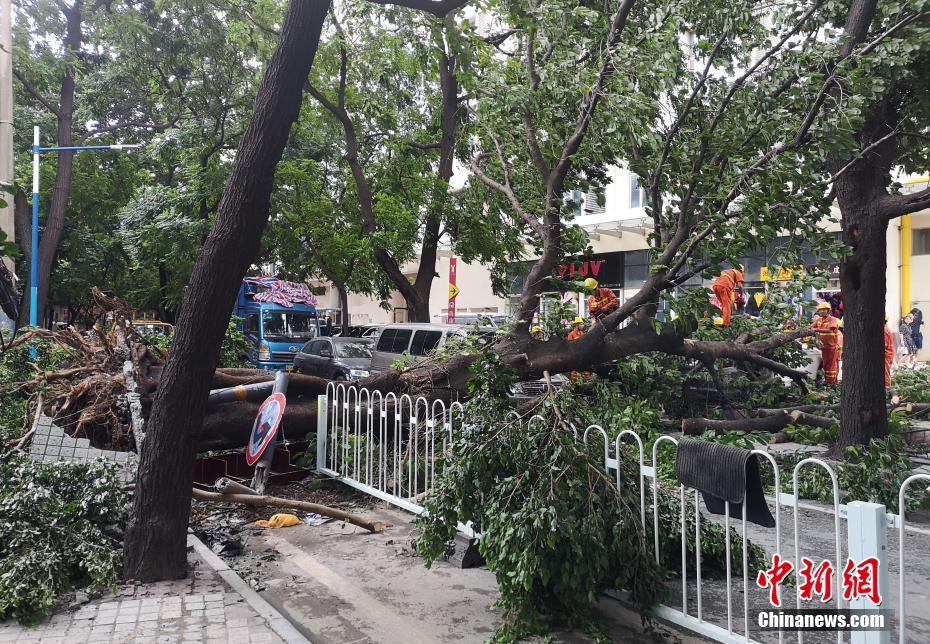 9月17日,广州市回龙路一棵数人合抱粗的大树横倒,多名市政设施维修人员手持电锯,试图将大树锯开运走,以恢复交通。16日登陆广东的台风“山竹”引发珠江水倒灌,广州多地遭受水浸,不少道路树木横倒,部分地下车库积水成“湖”。中新社记者 沈钊 摄