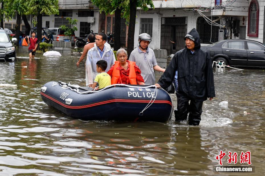 9月17日,广东江门台山大江镇侨园新村,救援人员使用皮划艇将村内被困民众转移出低洼地区。台山市人民政府17日通报,受强台风“山竹”影响,16日8时至17号12时,台山市普降大暴雨,局部特大暴雨,平均雨量157毫米(其中最大为四九镇379毫米),沿海烽火角水闸录得最高潮位2.24米。“山竹”登陆当晚,台山市境内的潭江流域出现超历史洪水位,超警戒洪水近一米,河堤漫顶,台山市沿江5个镇173村受到不同程度水浸。中新社记者 陈骥旻 摄