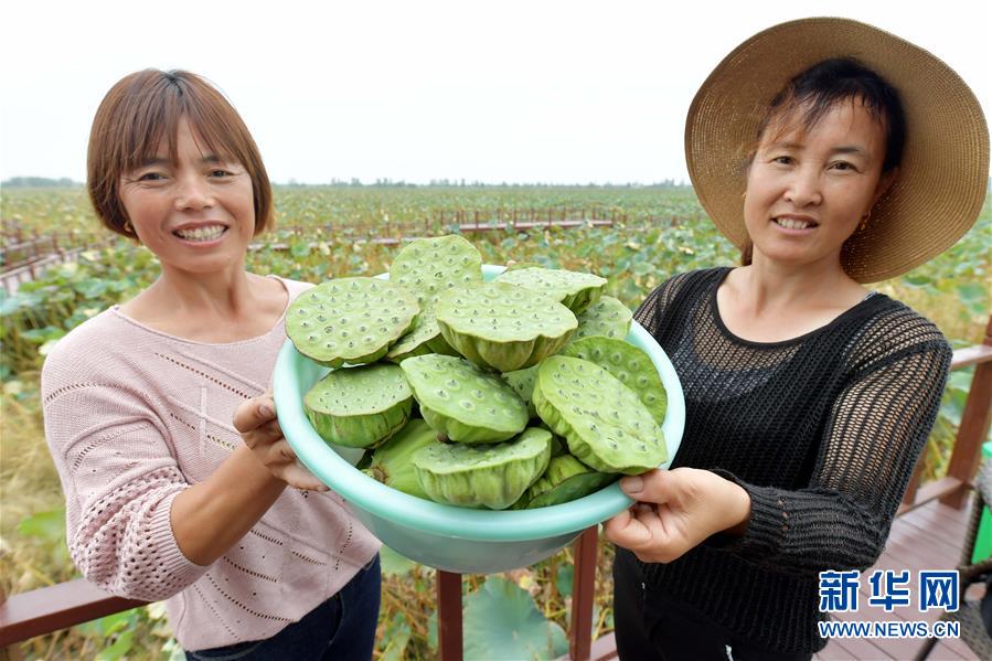 9月17日,农户在江西省南昌市新建区联圩镇鄱阳湖生态白莲产业园展示刚采摘的莲蓬。新华社记者 彭昭之 摄