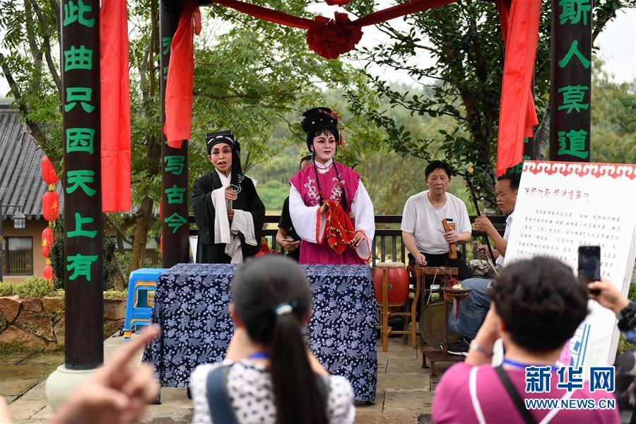 9月17日,在德清县庆祝首届“中国农民丰收节”活动的丰收市集上,当地农民在表演节目。新华社记者黄宗治摄