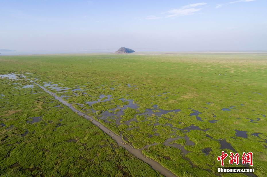 9月19日,航拍“中国最大淡水湖”鄱阳湖都昌水域,湖床变身茫茫草原。鄱阳湖标志性水文站星子站今年首次跌破12米,标志着鄱阳湖正式进入枯水期。据了解,鄱阳湖水位自今年2月起,较历史同期水位持续偏低。中新社发 傅建斌 摄