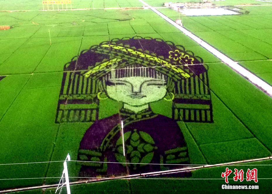 广西南宁市宾阳县古辣香米示范区高铁沿线位置,近日呈现出大型稻田艺术景观带。这条景观带总长度达3公里、画面占地面积500多亩,对宾阳县炮龙文化、昆仑关、蔡氏书院、蓝衣壮锦、农耕文化等多个主题进行集中展示,乘客乘坐在高铁上就可以观看美轮美奂的稻田艺术。图为稻田艺术画《最美蓝衣壮》。中新社发 翁仕宝 摄