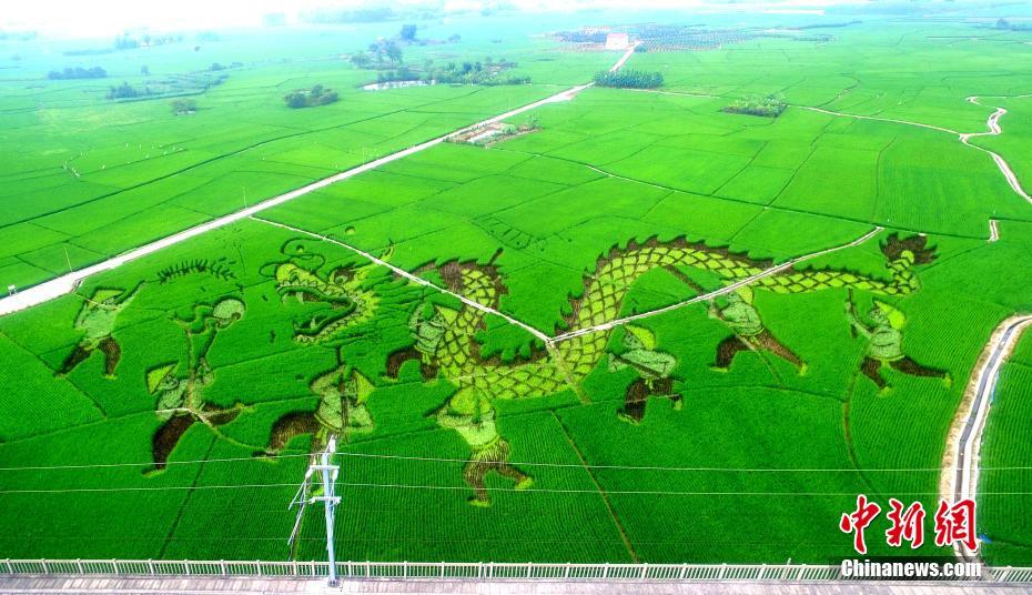 广西南宁市宾阳县古辣香米示范区高铁沿线位置,近日呈现出大型稻田艺术景观带。这条景观带总长度达3公里、画面占地面积500多亩,对宾阳县炮龙文化、昆仑关、蔡氏书院、蓝衣壮锦、农耕文化等多个主题进行集中展示,乘客乘坐在高铁上就可以观看美轮美奂的稻田艺术。图为稻田艺术画《中国炮龙之乡》。中新社发 翁仕宝 摄