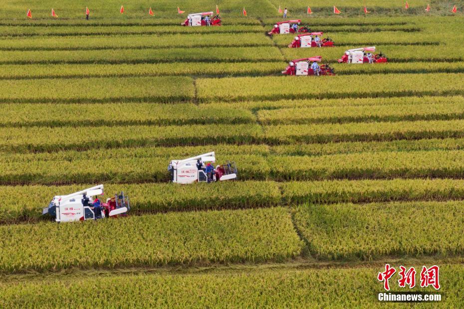 9月20日,江苏淮安盱眙县黄花塘镇新铺村虾稻共生示范基地内,数十台收割机踏着大地的音符穿梭在金黄的稻田里收割龙虾香米,在首届中国农民丰收节前夕“绘就”一幅美丽的秋收图。