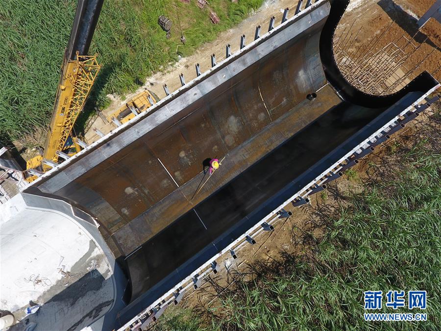9月21日,在广西来宾市兴宾区迁江镇,一名工人在引水渡槽内施工(无人机拍摄)。 新华社记者陆波岸摄