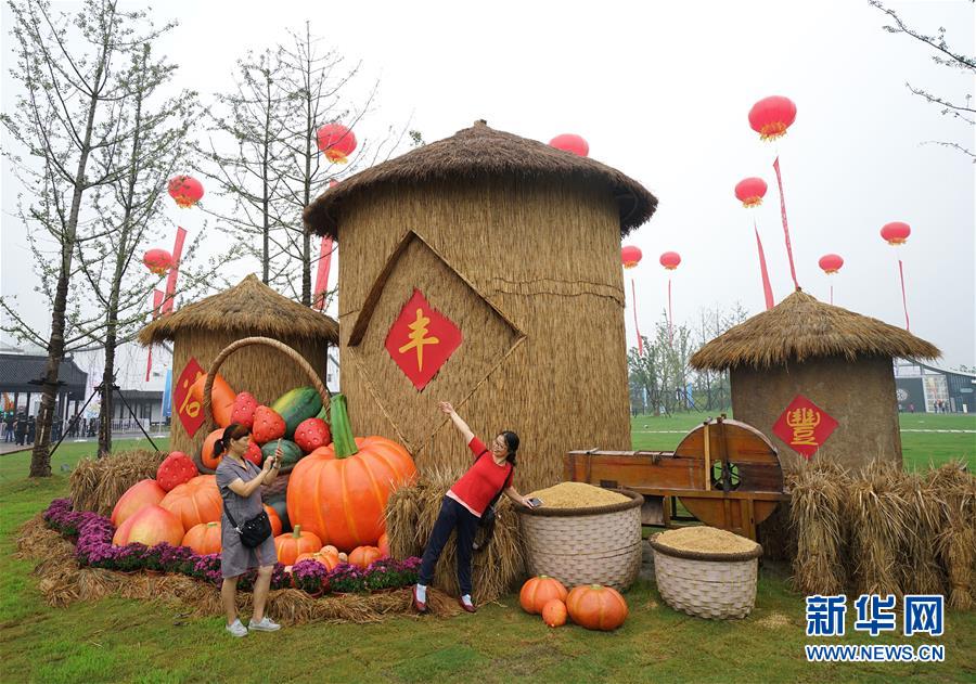 9月21日,游客在南京农业嘉年华活动现场的一处丰收主题景点留影。 当日,首届中国农民丰收节系列活动之一的第十四届南京农业嘉年华活动在南京八卦洲陌上花渡园区开幕。本届农业嘉年华突出农民主体和丰收狂欢,将开展农业旅游、文化展演、农趣体验、农业科普、美食展销、特色农产品销售等各类活动。 新华社记者 孙参 摄