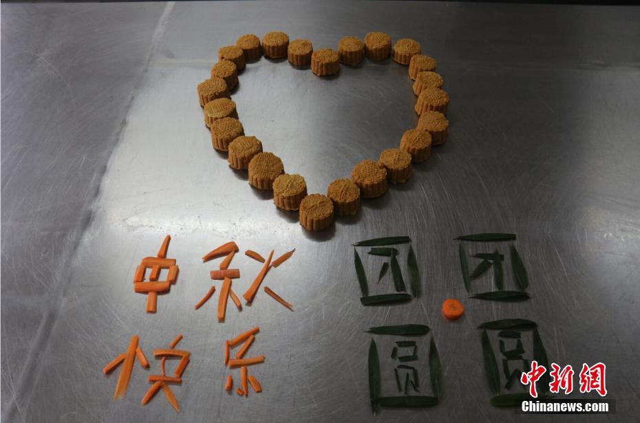 大熊猫专属月饼及大熊猫喜爱的食物拼出的节日祝贺图案。 钟欣 摄