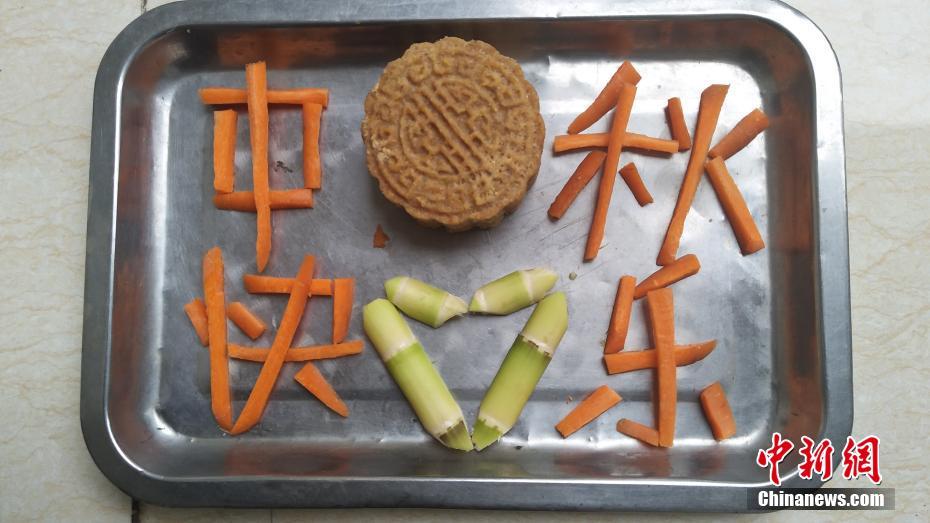 大熊猫专属月饼及大熊猫喜爱的食物拼出的节日祝贺图案。 钟欣 摄