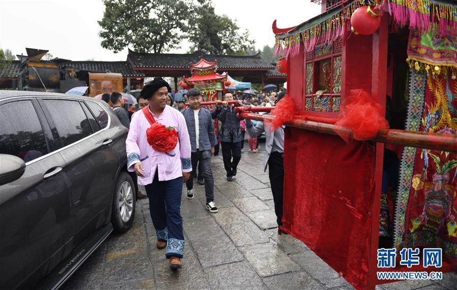 9月24日,施六金引领娶亲队伍进入十八洞村婚礼现场。 新华社记者 李尕 摄