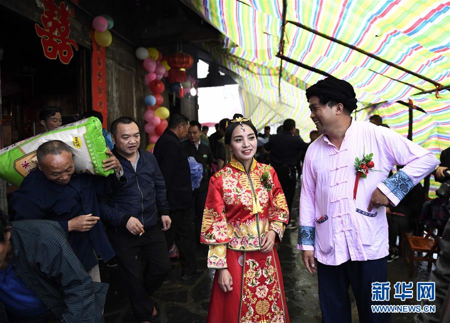 9月24日,婚礼开始前,施六金和新娘吴春霞在门口迎接客人。 新华社记者 李尕 摄