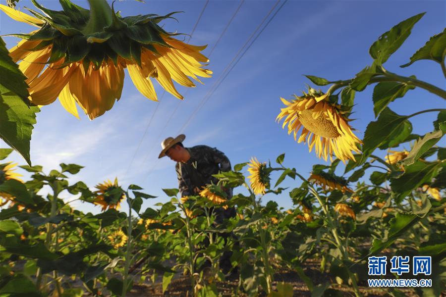 9月24日,河北唐山遵化市小厂乡粳子峪村农民在向日葵田间劳作。 金秋时节,河北唐山遵化市的农民抢抓农时,采收成熟的果实,进行作物管护等农事活动,田间一片忙碌景象。 新华社发(刘满仓 摄)