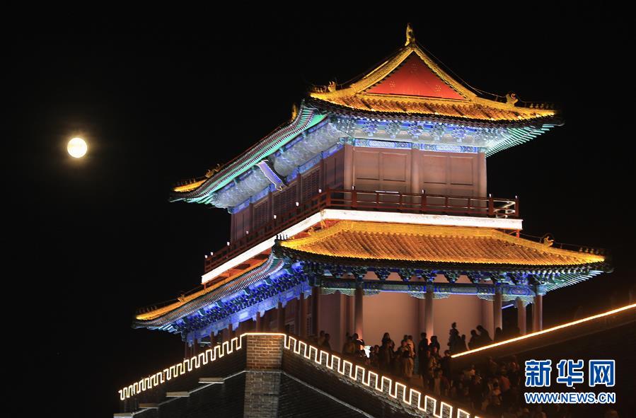 9月24日,游人在河北石家庄正定古城游览。 当晚,河北省石家庄市正定古城灯光璀璨,吸引众多游客游览赏景。 新华社发(张海强 摄)