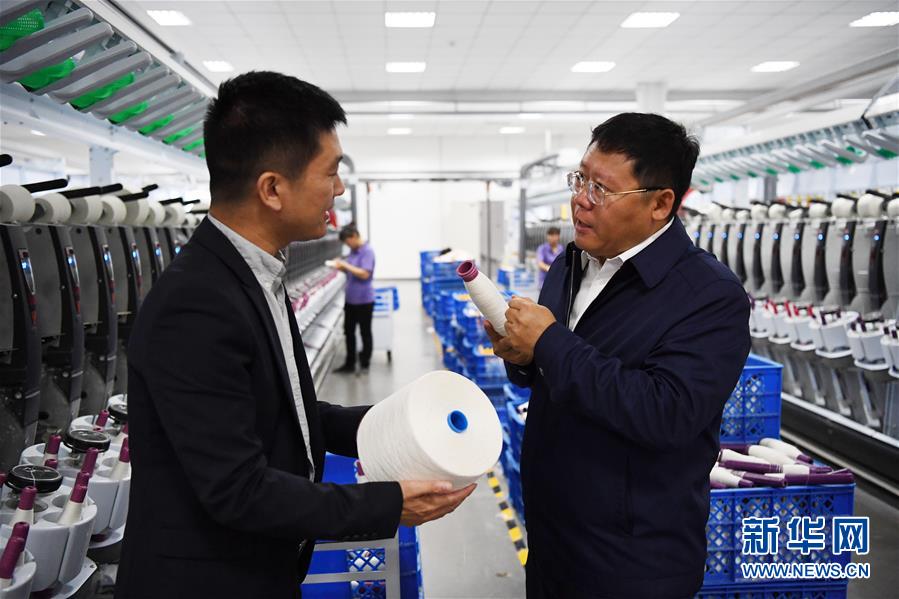 在黑龙江金达麻业有限公司生产车间,杨勇(右)向公司采购部经理徐峰了解企业生产情况(9月13日摄)。 冰川世纪时,猛犸象是最大的动物之一。“中国猛犸象故乡”、黑龙江省绥化市青冈县委书记杨勇被当地百姓戏称为“猛犸象”。 他不喊口号,不打官腔,不摆架子。作为大兴安岭南麓集中连片特困地区的一个县委书记,他从上任起,就为百姓操心,为事业添“薪”,为发展创新,激发起当地干部的担当与作为,把一个传统农业县带入发展快车道。 新华社记者王建威摄