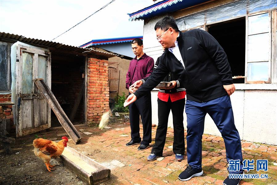 在黑龙江省青冈县劳动镇五星村的贫困户杜长山家院子里,杨勇(右)在了解禽畜饲养情况(9月13日摄)。 冰川世纪时,猛犸象是最大的动物之一。“中国猛犸象故乡”、黑龙江省绥化市青冈县委书记杨勇被当地百姓戏称为“猛犸象”。 他不喊口号,不打官腔,不摆架子。作为大兴安岭南麓集中连片特困地区的一个县委书记,他从上任起,就为百姓操心,为事业添“薪”,为发展创新,激发起当地干部的担当与作为,把一个传统农业县带入发展快车道。 新华社记者王建威摄