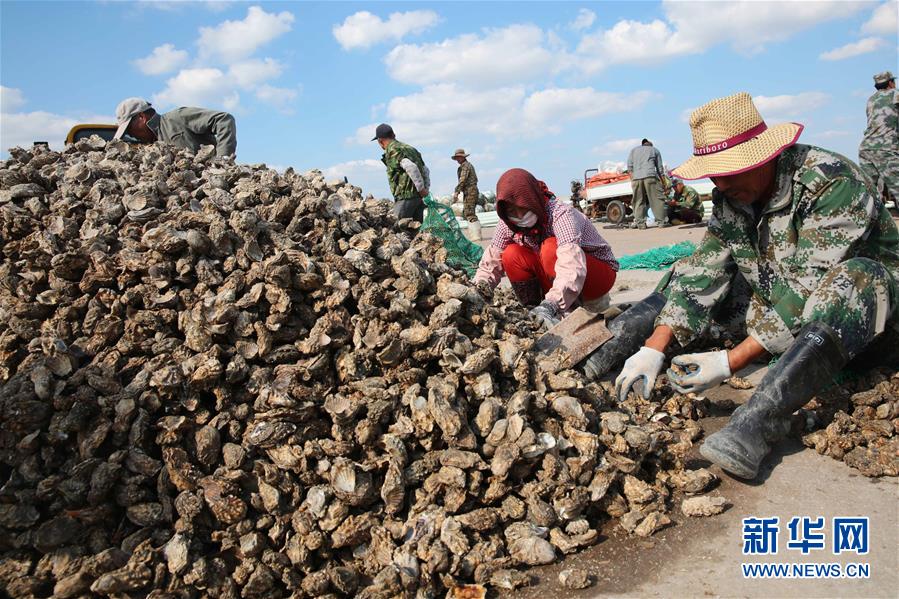 9月27日,在江苏连云港连云区东连岛村牡蛎养殖基地,养殖户在码头分拣牡蛎并装笼。