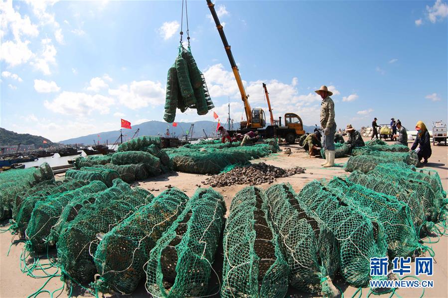 9月27日,在江苏连云港连云区东连岛村牡蛎养殖基地,养殖户在码头将分拣装笼的牡蛎吊装上船,准备出海布苗。 新华社发(朱华南 摄)