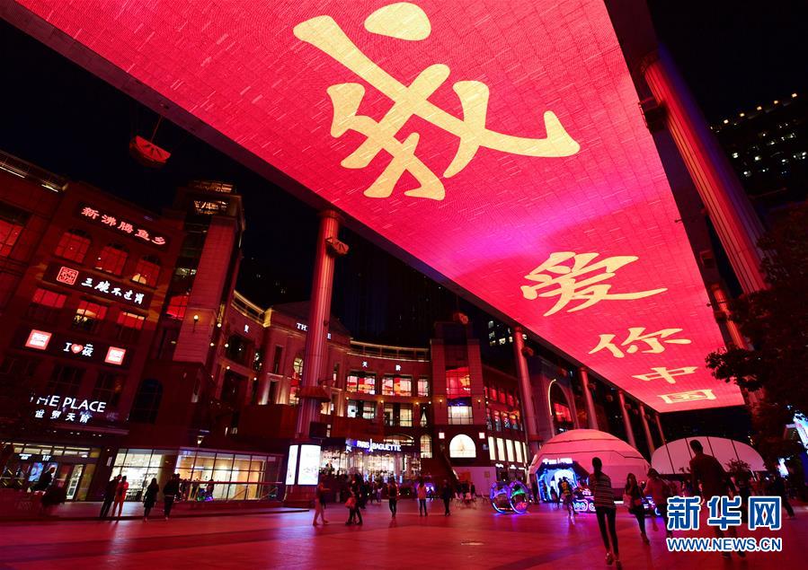 9月29日在北京世贸天阶拍摄的“我爱你中国”灯光秀。9月28日至10月7日,北京世贸天阶、国贸三期、永定门城楼等11处形式多样的“我爱你中国”灯光秀陆续亮起,营造国庆节日喜庆气氛。新华社记者 张晨霖 摄