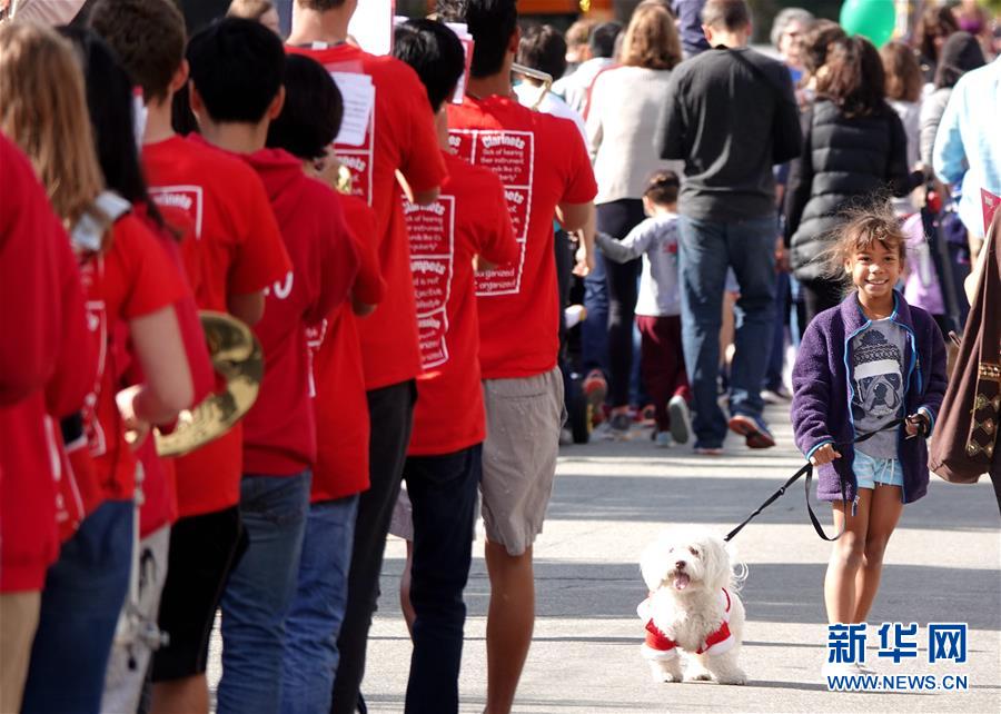 9月29日,在美国加利福尼亚州伯林盖姆市,一支学生乐队参加宠物狗大游行活动。美国加州旧金山湾区的伯林盖姆市29日举行宠物狗大游行活动。新华社记者 吴晓凌 摄